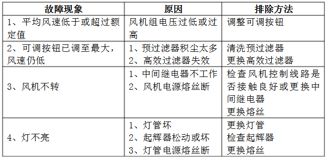 1.4、經(jīng)常注意工作區(qū)上方壓差表的指示。當(dāng)指針從綠色進入紅色區(qū)時,說明高效空氣過濾器的容塵量趨于飽和,應(yīng)調(diào)大風(fēng)機電壓,須再用風(fēng)速計測量工作區(qū)風(fēng)速,當(dāng)平均風(fēng)速<0.3m/s時,則該過濾器已經(jīng)失效,應(yīng)予以更換。 2、注意事項: